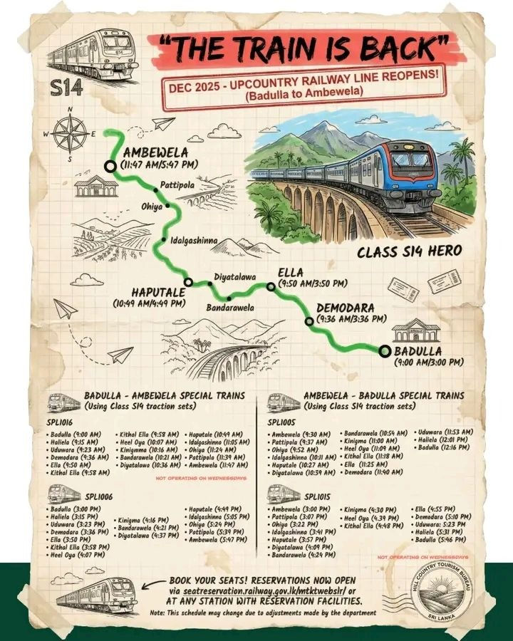 サイクロンの影響が奇跡的に殆どなかったエッラ方面は、かなり早い時期に運行を再開しており、現在紅茶鉄道とされるものはヌワラエリヤから車で約40分ほどの位置にあるアンベウェラ駅から終点のバドゥッラ駅までとなります。
